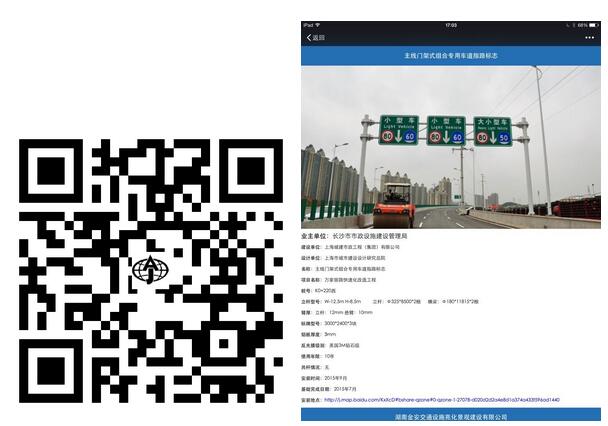 该管理系统的技术创新也得到了3M公司的大力支持,它将更高效、更系统的管理在道路上使用中的交通设施,以二维码的识读方式打开储存在网络服务器上的数据信息。公司安装在万家丽高架上的每一套单独的标志牌都将赋予一个二维码图案,每个产品上的二维码相当于一个产品的身份证,独一无二,用智能手机识读后,在有网络的情况下便可查看该产品详细信息,信息包括:业主单位、建设单位、设计单位、产品图片、产品名称、项目名称、桩号、立杆型号、壁厚、标牌型号、安装位置等。
